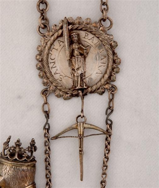 Ronde plaat. Koordvormige rand, waaromheen een zgn. uitgebekte rand. Opgelegde figuur van de patrones St.Barbara, met in haar rechterhand een tak en in de linkerhand een boek. Op de plaat gegraveerd "SANCTA BARBARA". Links en rechts boven en onder haken ivm de bevestiging aan de keten. Midden onder een gat, waaraan een kruisboog is bevestigd. Op kruisboog resten van verguldsel.