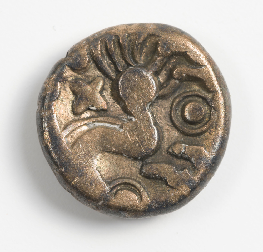 - BeschrijvingVz: Triquetum (driebenig motief), met aan één zijde vier bolletjes langs de rand. Kz: Naar links lopend paard met gespreide staart. Boven de nek een kruisje voor de hals en onder de buik een ring met een stip erin. Geslagen in de 1e eeuw v. Chr.