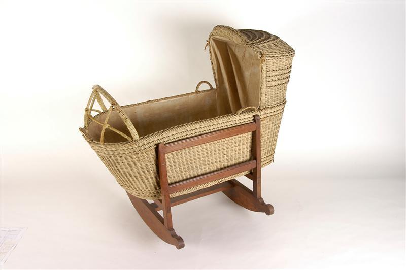 - BeschrijvingRieten wieg met kap op (losse) houten schommelsteun. Binnenzijde van de wieg voorzien van linnen bekleding.