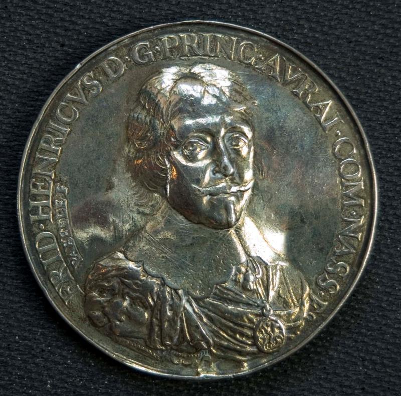 Op de voorzijde een borststuk van Frederik Hendrik. Op de keerzijde takken met daar omheen in cirkelvorm acht wapens( hand; drie bladeren; leeuw links, boom rechts; een wapenschild met onduidelijke invulling; drie rennende leeuwen en in het midden een wapenschild; een vijfpuntige ster; een sleutel in kruis; drie kruizen. Rond de wapenschilden afbeeldingen van divers wapentuig en helmen.