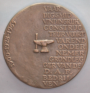 Vz: Borstbeeld van H. van Doorne 'en profil' naar rechts.Links langs de rand zijn naam rechts de datum. 1 jan 1965 Kz: In het midden een hamer en aambeeld. Links de jaartallen 1900-1928-1965. De linkerhelft van het veld is verder blanco, de rechterhelft wordt gewild met het opschrift.