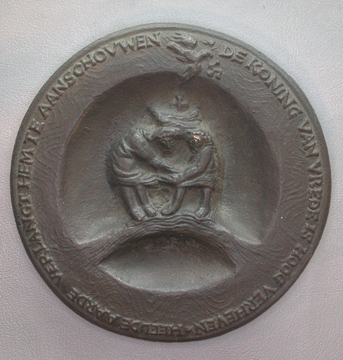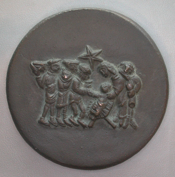 - BeschrijvingVz: In een verdiept veld de doop van Christus door Johannes in de Jordaan. Boven de voorstelling op de verhoogde rand een vredesduif met een olijftak in de snavel. Op de verhoogde rand het omschrift. Kz: De aanbidding van de drie koningen in hoog reliƫf op een vlak veld.