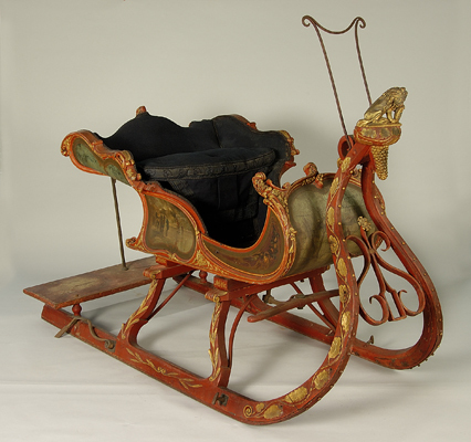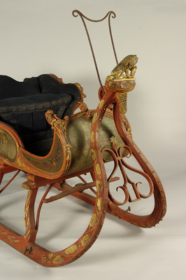 - BeschrijvingRood geschilderd, met goudkleurig, gesneden loofwerk op alle randen, een druiventros en leeuw met wapenschild op de kop, met wintergezichten beschilderde achter- en zijvlakken, blauwe stoffen zittingbekleding en koetsiertreeplank met zitting op ijzeren stang. Twee trekbomen.