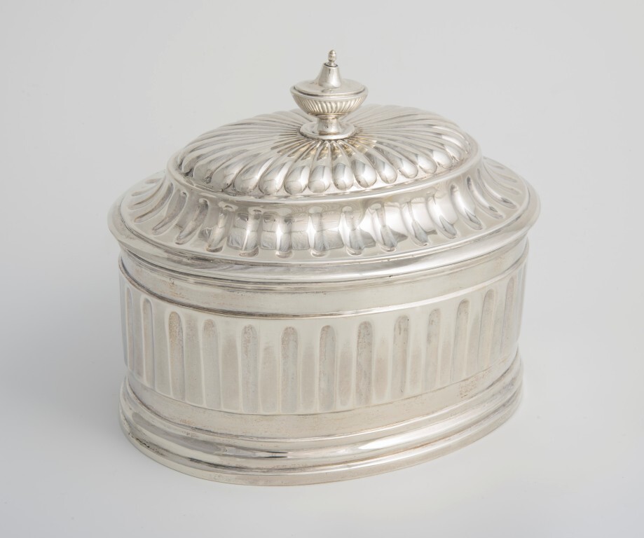 - BeschrijvingOvale gedrven zilveren tabakspot, bekroond met een vaasvormig ornament, gemerkt Roeland Verlegh, Breda, 1786.