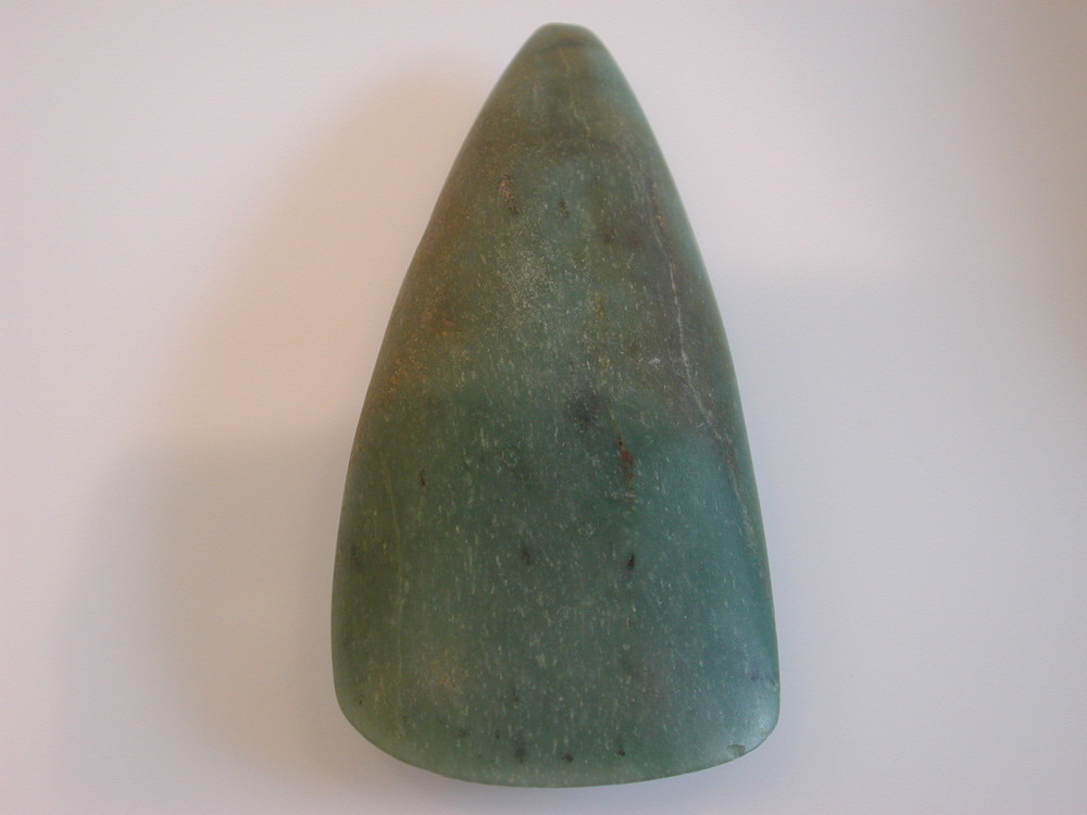 - BeschrijvingGepolijste vuurstenen, spitstoppige bijl van groene witgespikkelde steen. Fraai, geheel gaaf exemplaar.