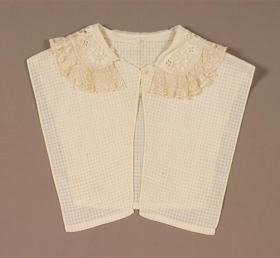- BeschrijvingChemisetje van witte katoen met ingeweven ruitjes. Kraagje van neteldoek met rand van open borduurwerk en afgezet met een gerimpelde strook kant.