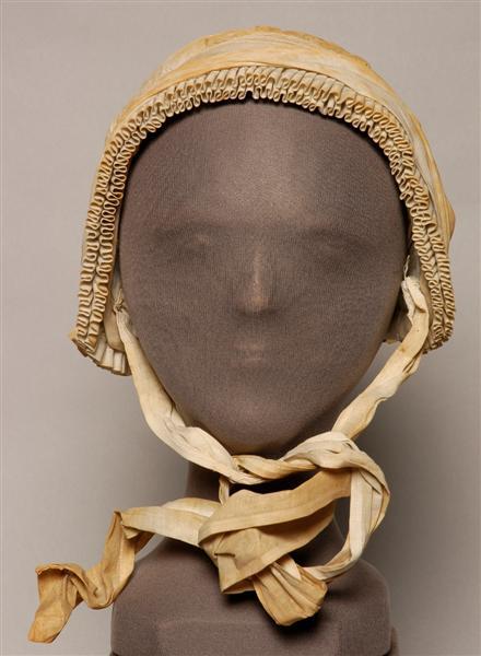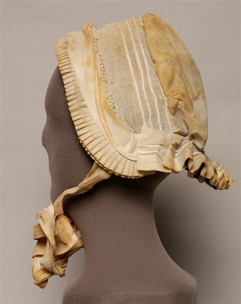 Mutsje uit Willemstad, geheel vervaardigd van neteldoek. 2 boven elkaar geplaatste, geplooide voor- stroken. Daaroverheen een band met 2 gerolde randen, aan beide zijden gedraaid, opgenaaid. Schildje met 3 opnaadjes. Onversierde bodem. Luifke grof geplooid met 2 opnaadjes en aan de binnenzijde verstevigd met donkerbruine sutiën. 2 striklinten. De rand van het mutsje is verstevigd met gevlochten stro. Vergelijk dit mutsje met inv.nr. 11841.