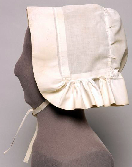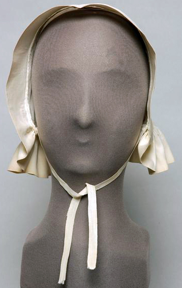 Mutsje van zeer fijne witte katoen, onbewerkt. Cornet met gladde voorstrook en schildje (brede strook achter de voorstrook), keperbandje aan de binnenzijde, op de naad tussen voorstrook en schildje. Bodem enigszins gerimpeld aan schildje genaaid. In de naad een smal katoenen randje. Door het zoompje onderaan in de bodem is een smal katoenen bandje geregen. De gladde voorstrook loopt gerimpeld door langs de zijkant van het schildje en glad langs de onderkant van de bodem. 2 katoenen striklintjes. Het geheel is zeer stijf gesteven en heeft een vouwtje naar beneden in het midden van de voorstrook.