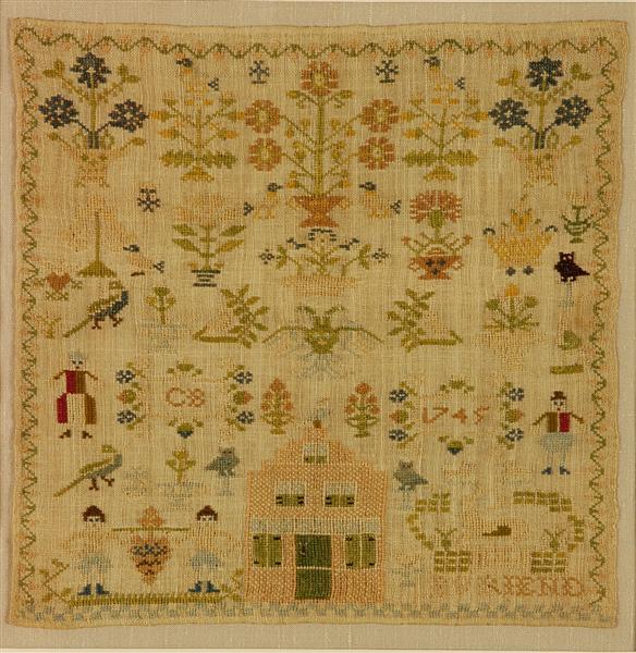 - BeschrijvingÉcru linnen lap, met kruissteekborduurwerk in zijde. Veelkleurig. In 2 cartouches met bloemen: "CB" en "1745". Rechtsonder: "PVRIEND". Voorstelling: levensbomen, vogeltjes, uilen, dubbelkoppige adelaar, de verspieders van Kanaän, man en vrouw, hert in tuin, huis (voorgevel), rijksappel, gekroond hart. Omranding: zigzagrandje met bloemetjes en blokjes.