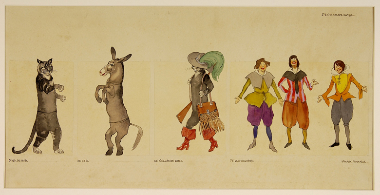 - BeschrijvingDe Gelaarse Kater I: 1. Does, de kater; 2. De ezel; 3. De gelaarsde Kater; 4. De drie verlosten. Taferelen zijn in vier afzonderlijke rechthoeken geplaatst. Het geheel is een langwerpig karton.