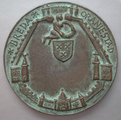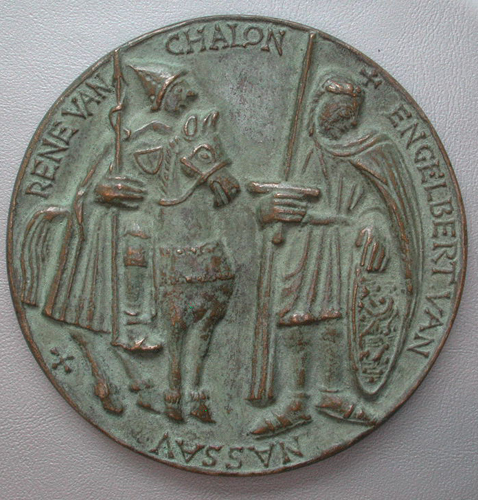 - BeschrijvingVz:René van Chalon te paard (links) en Engelbert van Nassau (rechts), beiden in ridderuitrusting. Omschrift: RENE VAN CHALON + ENGELBERT VAN NAS¬SAV + Kz:stadswapen van Breda, daarboven een Genius met een zegepalm; het geheel omsloten door stadsmuren. In het midden een blanco veld voor een inscriptie. Omschrift: *BRED¬A*ORANJESTAD
