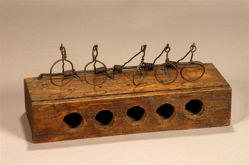 - BeschrijvingWurgval voor 5 muizen Rechthoekig stok hout met aan de lange zijde 5 holtes naast elkaar. Aan de bovenkant van elk ervan zijn twee pinnen bevestigd. Elke holte is voorzien van een strik (door een gleuf in de bovenwand heen) die op het blok is bevestigd met een veer en voor de holte wordt gehouden door een touwtje.
