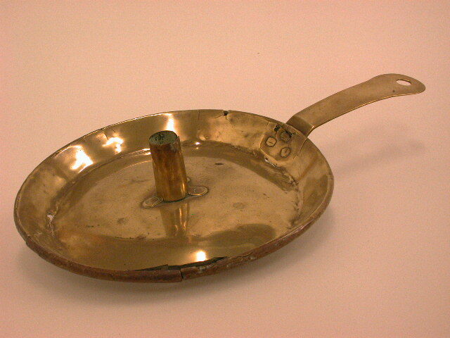 - BeschrijvingIn koekepanvorm met iets holle bodem, schuine rand, van boven rond een ijzeren steunring geslagen, een met drie nagels aan de rand bevestigd plat koperen steel met ophangoog en een centraal cylindrische kaarsenhouder met drie voetlippen.