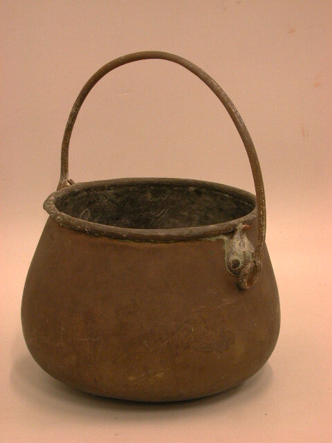 - BeschrijvingWaterketel met zak, hoog 8.5 cm, waarboven gedrongen bolle buik, overgaand in cylindrisch lichaam, waarop twee tongen voor het platkoperen hengsel. S-vormige tuit, geprofileerde deksel met eikelknop.