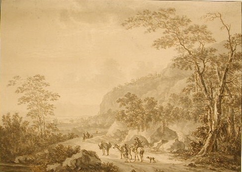 - BeschrijvingBergachtig landschap met op de voorgrond een weg waarop twee mannen en drie ezels lopen.