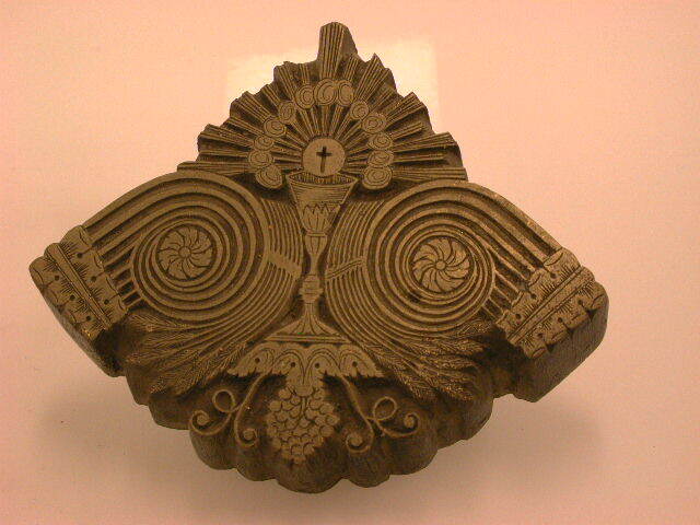 - BeschrijvingHoek cliché. Ongeveer kwartcirkelvormig, met een kelk en hostie in stralenkrans, tussen korenschoven, druivenranken en spiraalvormige ornamenthoeken. Identiek aan inv.nrs. 09811.3 t/m 09811.5.