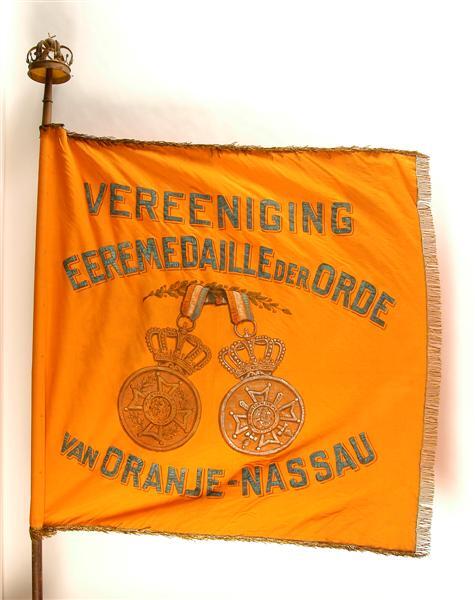 Oranje vaandel. Op de voorzijde de geschilderde voorstelling van een zilveren en een bronzen medaille van de Orde van Oranje-Nassau. De medailles zijn gehangen aan een tak met oranje bessen. Boven de medailles in zwart en turkoois schilderwerk de naam "VEREENIGING EEREMEDAILLE DER ORDE". Onder de medailles in dito schilderwerk: "VAN ORANJE-NASSAU". De letters hebben schaduwletters in bruine verf. Op de achterzijde het gekroonde wapen van het koninkrijk der Nederlanden, gehouden door twee gekroonde leeuwen, staande op een banderol met opschrift "JE MAINTIENDRAI". Tussen banderol en wapen groen lofwerk. Het vaandel is aan 3 zijden afgezet met goudfranje. Aan stokzijde is het om de stok geslagen en met spijkers vastgezet. Om het vaandel een hoes van zwart zeildoek.