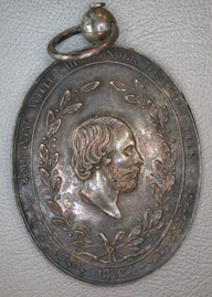Voorzijde: Portretbuste van koning Willem III naar rechts, omgeven door een lauwerkrans. Daaromheen een getrokken rand. Omschrift: Z:M:KONING WILLEM III BYZONDER BESCHERMHEER/1852 Keerzijde: Binnen een getrokken rand het gekroonde stadswapen van 's-Hertogenbosch, geflankeerd door twee wildemannen. Daaronder twee gekruiste geweren. Omschrift: KONINKLYK SCHERPSCHUTTERS GILDE/VINCIT CONCORDIA FRATRUM
