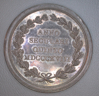 Voorzijde: Het wapen van de Illustre Lieve Broederschap (een lelie tussen doornen). Boven het wapen als schildhouder een zwaan, met een banderol in de snavel, waarop het devies staat: SICUT LILIUM INTER SPINAS Omschrift: CONFRATERNITAS BEATAE MARIAE VIRGINIS/SYLVAEDUCIS Keerzijde: Binnen een krans een lauwertak en een eiketak het opschrift: ANNO/SECULARI/QUINTO/MDCCCXVIII