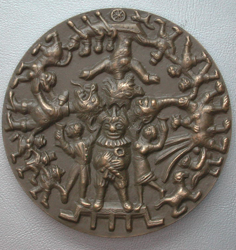 - BeschrijvingVoorzijde: Een narrenschip met het opschrift: CAR/NA/VAL/19/59. In het schip een figuur die een vis opheft, als symbool van de vasten. Omschrift: CVM JEJVNATIS NOLITE FIERI SICVT HYPOCRITAE TRISTES Keerzijde: Carnavalsfiguren rondom Prins Carnaval, die op een podium staat. Uitgegeven door de Vereniging voor Penningkunst als eerste penning van 1959.