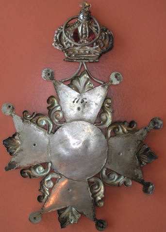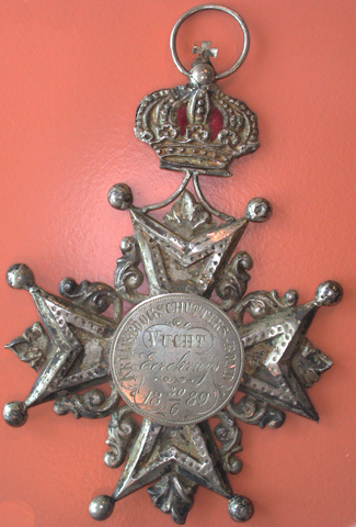 Insigne in de vorm van een Maltezer kruis met bladversieringen tussen de armen. Boven aan het kruis is met een scharnier een kroontje bevestigd, dat met rode stof is opgevuld. Aan de kroon een oogje met een ring. In het hart van het kruis een ronde holle ruimte. Op het deksel het gegraveerde opschrift: KRUISBOOSCHUTTERS-BOND/VUCHT/Eerekruijs/18 30/6 89. Om het opschrift een parelrand. Het insigne is gedreven en aan de achterzijde afgedekt met plaatjes.
