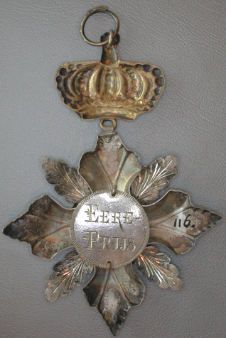 Een grieks kruis, waarvan de armen in bladeren uitlopen tussen de armen vier eikebladen in kruisvorm. Aan de bovenzijde is scharnierend een verguld kroontje bevestigd, waaraan een oogje met een ring. Op het kruis is aan de voor- en achterzijde een plaatje bevestigd. Het (vergulde) plaatje aan de voorzijde draagt het opschrift: St JOSEPHS-GILDE/Vught/18 28-7 89 Hieromheen een parelrand. Het plaatje op de achterzijde draagt binnen een parelrand het opschrift: EERE-/PRIJS