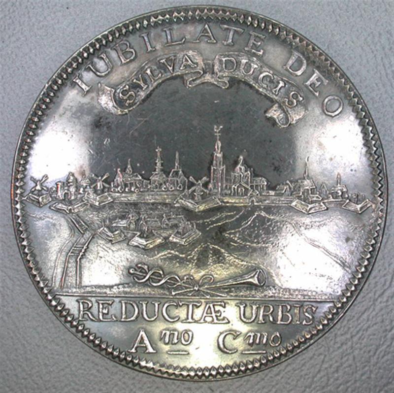 Vz:gezicht op de stad van de Vughterzijde; op de voorzijde de schans Sint Antonie, een mercuriusstaf en een trompet; opschrift: JUBILATE DEO en daaronder op een geplooide banderol: SYLVADUCIS; in de afsnede: REDUCTA URBIS Ano Cmo