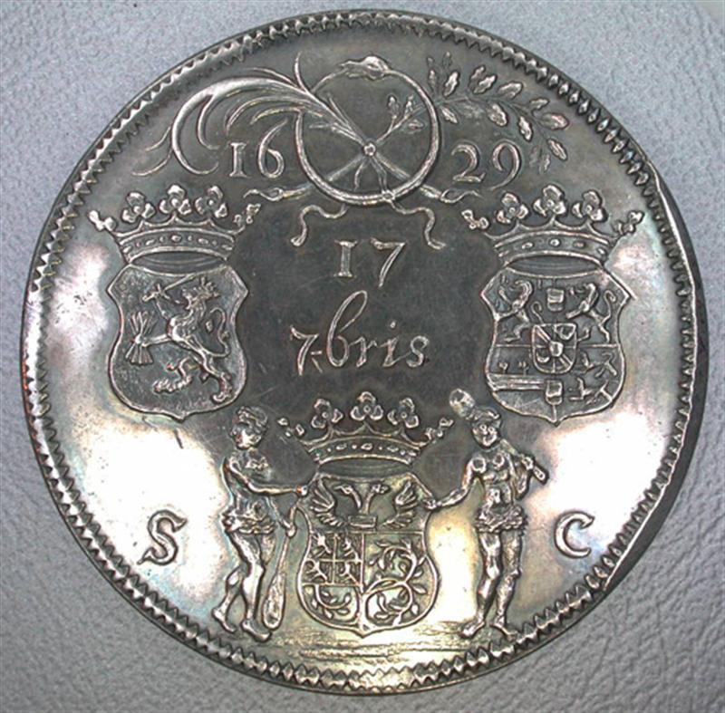 Kz:midden in de penning 177bris, links het wapen van de Staten Generaal, rechts het wapen van Frederik Hendrik; boven een zich in de staart bijtende slang, waardoor¬heen een gekruiste lauwer- en palmtak en het jaartal 1629; onder het gekroonde stadswapen, geflankeerd door twee wildemannen en de letters S en C