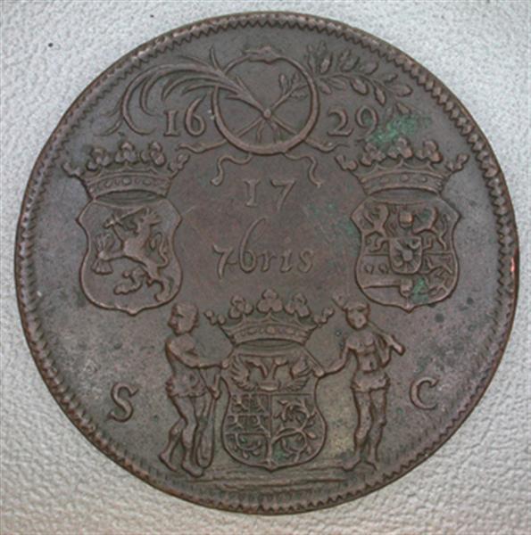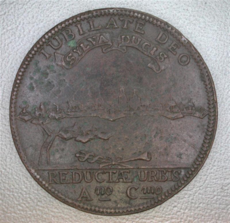 Voorzijde: Gezicht op 's-Hertogenbosch uit het zuiden. Boven het opschrift IUBILATE DEO daaronder op een banderol : SYLVA D[UC]IS Op de afsnede onder: REDUETAE URBIS/Ano Cmd ("Het eeuwjaar van de herkregen stad"). Om het geheel een parelrand. Keerzijde: Tussen de gekroonde wapens van Oranje (rechts) en de Algemene Staten (links) de datum 17/7 bris. Erboven een cirkelvormige slang, waardoorheen twee palmtakken zijn gestoken, geflankeerd door het jaartal 16-29. Eronder het gekroonde stadswapen van 's-Hertogenbosch, geflankeerd door twee wildemannen en de letters S en C. Om het geheel een parelrand.