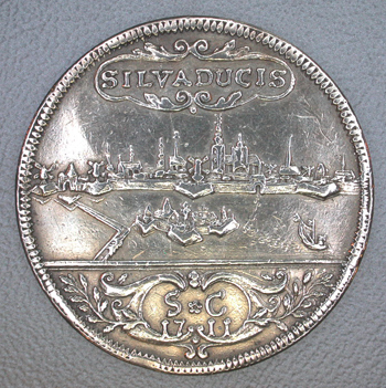 Voorzijde: Gezicht op 's-Hertogenbosch uit het zuiden. Op de voorgrond de straatweg, de schans St. Anthonie en rechts een scheepje. Boven binnen een rand met lofwerk: SILVA DUCIS Op de afsnede binnen een rand met lofwerk en bladmotieven: S.C./1711 om het geheel een parelrand. Keerzijde: De Gerechtigheid zittend, het zwaard en de weegschaal in de linkerhand, in de rechter een lauwerkrans die boven het stadswapen (links) gehouden wordt. Uiterst rechts een altaar met een geopend boek. Rechts op de voorgrond een hoorn des overvloeds. Opschrift: SALUS PUBLICA ("Algemeen welzijn"). Om het geheel een parelrand.