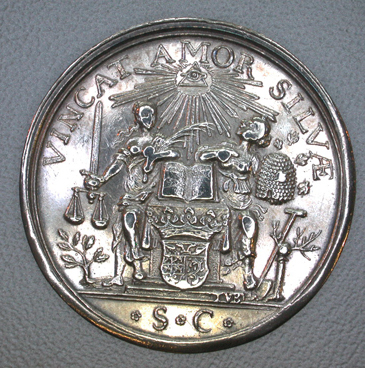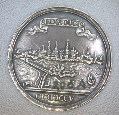 Voorzijde: Gezicht op 's-Hertogenbosch uit het zuiden. Op de voorgrond de straatweg, de schans St. Anthonie en rechts een scheepje. Op de banderol boven de stad: SILVA DUCIS (ingeslagen) Op de afsnede CI.I.CCVI (laatste cijfer weggestoken i.p.v. puntje een omgekeerde C). Keerzijde: Ter weerszijden van een altaar, waarop een opengeslagen boek ligt met daarboven het Alziend Oog, staan de Gerechtigheid (links) met zwaard en palmtak in de linkerhand, en de Nijverheid (rechts) met bijenkorf en spade. Tegen het altaar het gekroonde stadswapen van 's-Hertogenbosch. Opschrift: VINCA[T] AMOR SILVAE Op de afsnede: .S.C.