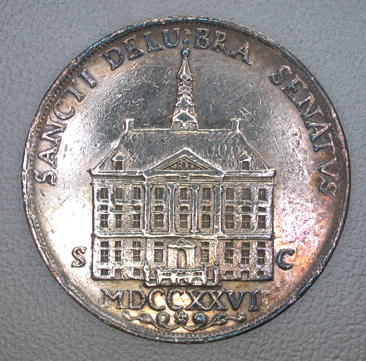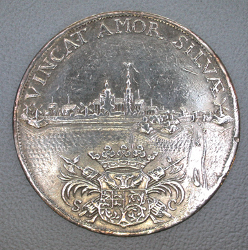 Voorzijde: Gezicht op de stad uit het noorden. Erboven het opschrift: VINCAT AMOR SILVAE ("Dat de liefde tot Den Bosch zegeviere). Op de voorgrond het gekroonde stadswapen van 's-Hertogenbosch, met daarachter twee gekruiste bijlbundels. Keerzijde: De voorgevel van het stadhuis, geflankeerd door de letters S en C. Onder de gevel het jaartal MDCCXXVII, waarvan de laatste I is weggestoken, en lofwerk. Omschrift: SANCTI DELUBRA SENATUS ("De zetel van de heilige raad").