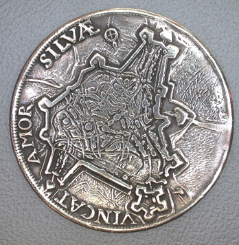 Vz:gezicht op de stad van de Orthenzijde; op de Dieze twee scheepjes; op de voorgrond tussen de letters S en C het gekroonde stadswapen met twee bijlbundels en twee palmtakken; opschrift : VINCAT AMOR SILVAE