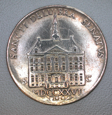 Kz:het stadhuis tussen de letters S en C; boven: SANCTI DELUBRA SENATUS, onder: MDCCXXVII (de laatste I is weggestoken), met lofwerk eronder