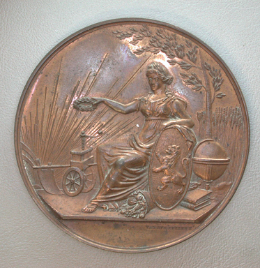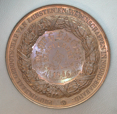 Voorzijde: Een zittende vrouw, de linkerhand steunend op een schild met het wapen van Brabant, waarachter een globe, een paar boeken, een boom en een korenveld. In de rechterhand houdt zij een lauwerkrans boven een ploeg. Achter de ploeg zonnestralen. Aan de voeten van de vrouw een hoorn des overvloeds. Op de afsnede: VAN DER KELLEN F Keerzijde: Binnen een zware krans het gegraveerde opschrift: Jhr Mr H.F. de Grez/BESTUURDER/1846. Omschrift: PROVINCIAAL GENOOTSCHAP VAN KUNSTEN EN WETENSCHAPPEN IN NOORD-BRABAND, vijfbladige bloem.