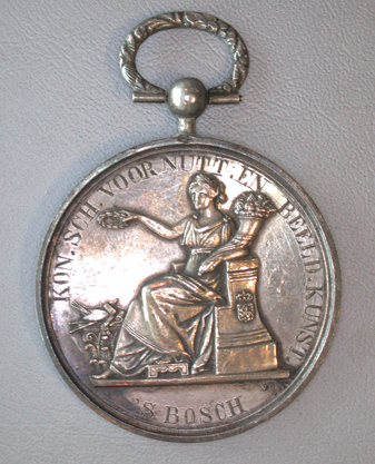 Voorzijde: Een zittende vrouw met een hoorn des overvloeds onder de linkerarm, houdt met de rechterhand een lauwerkrans boven de schilder- en tekengereedschappen aan haar voeten. Gegraveerd omschrift: KON.SCH. VOOR NUTT. EN BEELD.KUNST./'S BOSCH Keerzijde: Gegraveerd opschrift: TEEKENEN NAAR/PLEISTERKOPPEN/1e PRYS/AAN A.VRENSEN/CURSUS 18 55/56 Aan de bovenzijde een knop met een versierde ring.