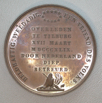 Voorzijde: Naar links gewende buste van Willem II. Omschrift: WILLEM II KONING DER NEDERLANDEN Keerzijde: Onder een krans van twaalf sterren het opschrift: OVERLEDEN/TE TILBURG/XVII MAART/MDCCCXLIX./DOOR NEDERLAND/DIEP/BETREURD Daaronder een met een doek bedekte vaas, een scepter en een takje. Omschrift: HELDHAFTIG, WELDADIG. - EEN VRIEND DES VOLKS.