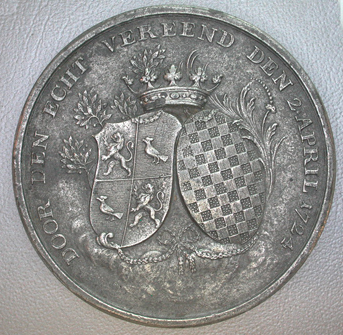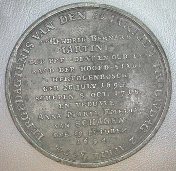 Voorzijde: De twee familiewapens van het echtpaar door ranken omgeven, met een kroon midden erboven. Omschrift: DOOR DEN ECHT VEREEND DEN 2. APRIL 1724 Keerzijde: In het midden het opschrift: HENDRIK BERNARD/MARTINI/OUD PRESIDENT EN OUDSTE/RAAD DER HOOFD-STADT/'s HERTOGENBOSCH/GEB. 20 JULY 1693/SCHEPEN 8 OCT.1718/EN VROUWE/ANNA MARIA EMELIA/VAN SCHAGEN/GEB. 19 OCTOBER/1694 Omschrift: TER GEDAGTENIS VAN DEN 50 JARIGEN TROUWDAG 2 APRIL 1774 Loden proefslag van deze penning zijn 18 gouden en 46 zilveren exemplaren geslagen.