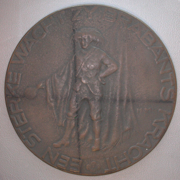 Voorzijde: Een gildebroeder met het gildevaandel over de schouder. Omschrift: EEN STERKE WACHT ZY BRABANTS KRACHT, vierbladige bloem. Keerzijde: Een boerenwoning, waarboven de zon opgaat. Midden onder het gekroonde wapen van Noord-Brabant, omgeven door een zware krans van vruchten. Boven de zon gegraveerd: 1898 1923 Omschrift: TER HERINNERING AAN HET 25 JARIG REGEERINGS JUBILEUM VAN H.M.KONINGIN WILHELMINA *