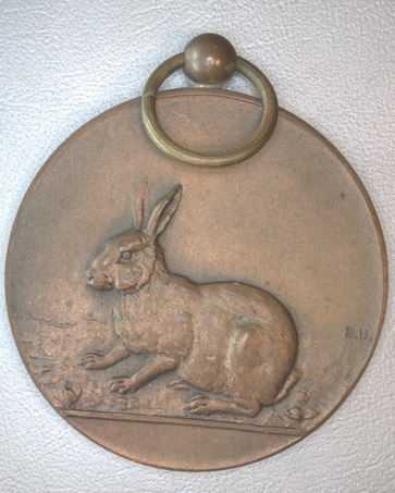 - BeschrijvingVoorzijde: Een konijn. Blanco afsnede. Keerzijde: Omschrift: NOORDBRABANTSCHE MAATSCHAPPIJ VAN LANDBOUW* in het middenvlak: AFD. ZEVENBERGEN/TENTOONSTELLING/1924/ E.PRIJS (Prijs niet ingevuld.) Aan de bovenzijde een knop met een ring.