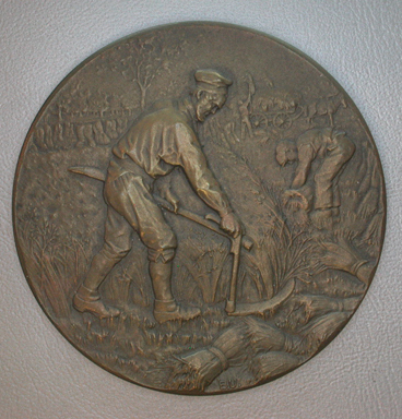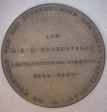 - BeschrijvingVoorzijde: Een maaiende boer in een korenveld rechts een schovenbinder en op de achtergrond een hooiwagen. Keerzijde: Omschrift: DE PACHTERS VAN HET STAATSDOMEIN RENTAMBT "OOSTERHOUT"* In het midden: AAN/G.A.M. GROENEVELDT/RENTMEESTER DER DOMEINEN/1899 - 1920.