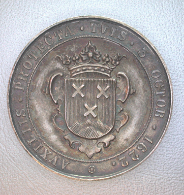 De maskerade van dat jaar had als thema de intocht van prins Maurits in Bergen op Zoom in 1622. Voorzijde: Binnen een parelrand een verdiept middenveld met daarop het gekroonde stadswapen van Bergen op Zoom, omgeven door een rolwerk-omlijsting. Omschrift: AVXILIIS.PROTECTA.TVIS. 3 OCTOB.1622., vijfbladige bloem Keerzijde: Een blanco veld, met bovenin twee ingeslagen handen. Omschrift: IN MEMORIAM FESTI DIEI NATALIS CCCXX.ACAD.LVGD.BAT.XVIII JVN.A.MDCCCXCV, vijfbladige bloem. De voorzijde is volgens Wonders een copie naar de voorzijde van de ter gelegenheid van de intocht van Maurits in 1622 geslagen penning.