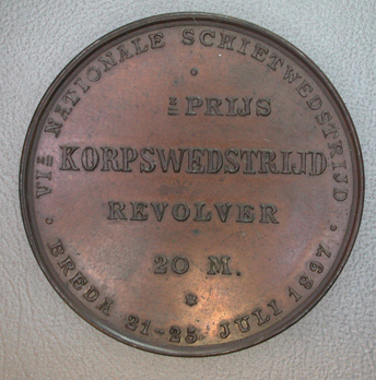 - BeschrijvingVoorzijde: Het wapen van Nederland binnen een doorlopende rand. Omschrift: *VEREENIGING VAN NEDERLANDSCHE SCHERPSCHUTTERS Keerzijde: In het middenveld het opschrift: E PRIJS/KORPSWEDSTRIJD/REVOLVER/20 M./ Omschrift: .VIE NATIONALE SCHIETWEDSTRIJD./BREDA 21-25 JULI 1897