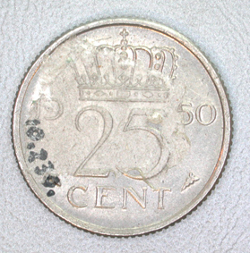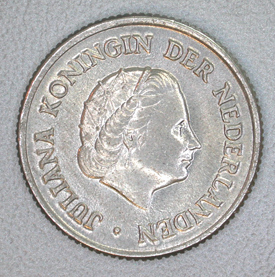Nikkelen Ned. munt 25 cent met profielportret Koningin Juliana, 1950