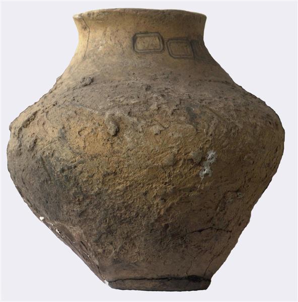 - BeschrijvingFlesvormige geelbruine, scheefgetrokken, ongelijk dubbelconische, besmeten urn, hals ingesnoerd, rand naar buiten omgebogen en niet verdikt. In de bodem beschadigd.