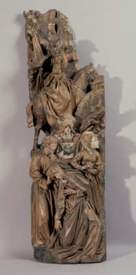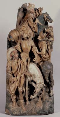 - BeschrijvingTwee delen van een calvarieberg scene van een passie altaar. De bezwijming van Maria en soldaten te voet en te paard.