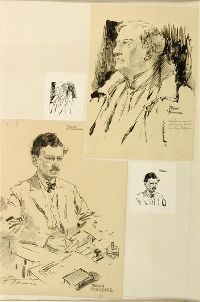 - BeschrijvingTwee krijttekeningen en twee cliché's geplakt op een vel karton. Geannoteerd: - (op bovenste tekening) "teekening naar de/geboetseerde buste/van Aug. Falise." - (op karton): "Opening der nieuwe K.T.A. 26 Nov. No 274.1927"