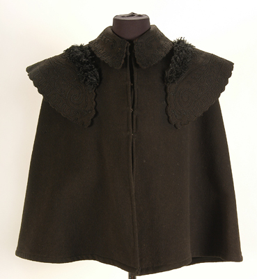 Pelerine van zwart wollen dubbelweefsel in keperbinding, geruwd. Langs de hals een kraagje met geschulpte rand. Over elke schouder een grote kraag, eveneens met geschulpte rand, langs de bovenkant afgezet met zijden franje. Grote stolpplooi in het midden van het rugpand. Onder in de plooi is een kleinere stolpplooi. Kragen en grote plooi versierd met opgenaaid zwart koord. Sluiting bovenaan met 2 metalen haken en ogen, in het midden met 3 metalen haken en ogen. Onder deze laatste een beleg. Langs beide randen middenvoor een beleg van zwarte keperkatoen op zwart voeringlinnen. De hals en naden zijn afgewerkt met zwarte keperkatoen. De kragen zijn gevoerd met zwart vilt, het kraagje langs de hals bovendien met zwarte keperkatoen.