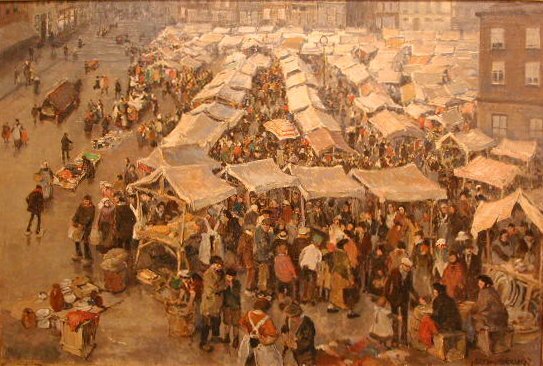 - BeschrijvingDe Bossche markt met kramen waartussen talloze mensen lopen.
