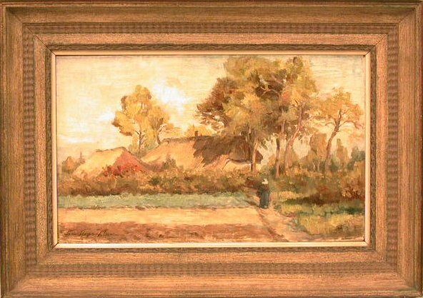 - BeschrijvingGezicht op een boerderij, verscholen tussen de bomen. Op een pad loopt een boerin.